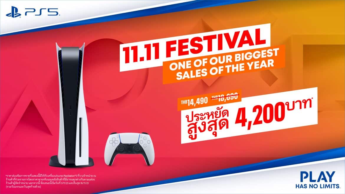 PlayStation ขอประกาศแคมเปญพิเศษ “11.11 Festival” ที่จะเริ่มตั้งแต่ 3 – 16 พฤศจิกายน 2566 โดยผู้เล่นสามารถซื้อเครื่องเกม PlayStation 5 พร้อมส่วนลดสูงสุดถึง 4,200 บาท