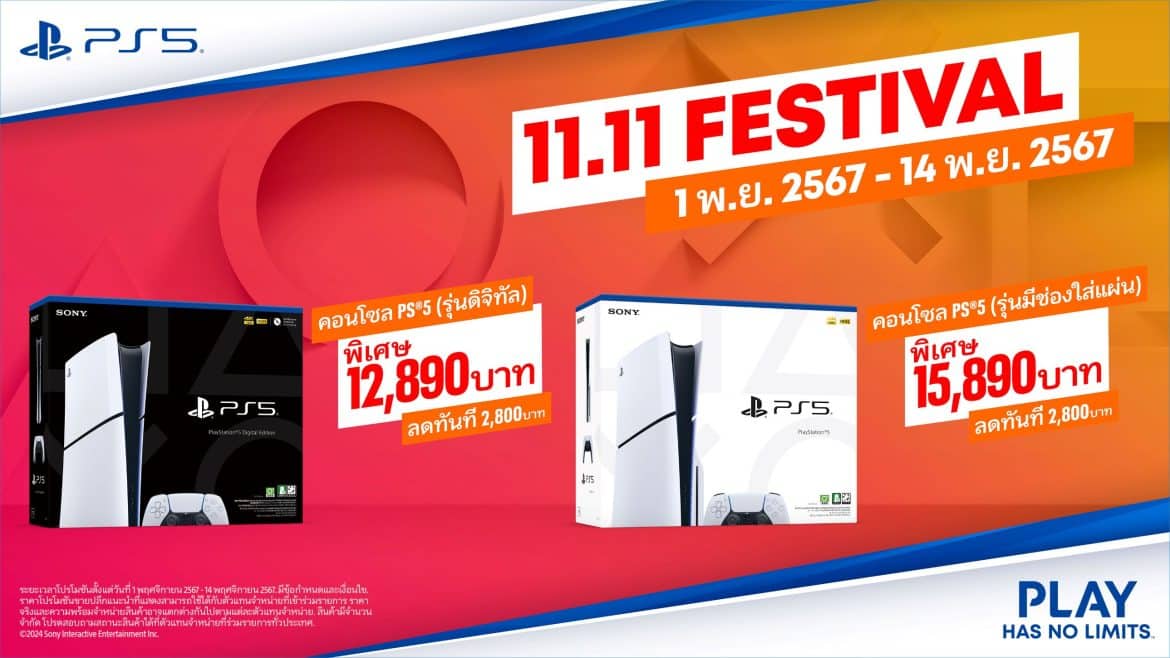 Sony Interactive Entertainment มีความยินดีที่จะแจ้งให้ท่านทราบว่า ในวันที่ 1 ถึง 14 พฤศจิกายน 2567 จะมีการจัดโปรโมชัน “11.11 Festival” กับการมอบส่วนลดพิเศษสำหรับคอนโซล PlayStation 5 อุปกรณ์เสริม และเกมต่าง ๆ อีกมากมาย